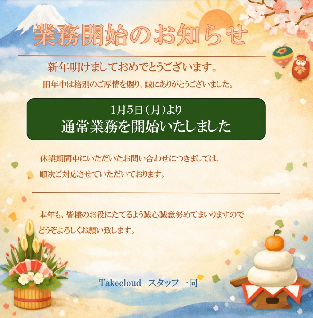 - 業務開始のお知らせ新年あけましておめでとうございます。年末年始休業を終え、本日より通常通り営業を開始いたしました。 休業中にいた… 続きを読む: 業務開始のお知らせ